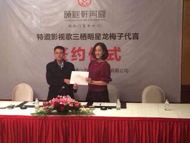 經過嘉華明星演出公司專業團隊的努力,20131226日,我司攜歌手龍梅子抵達北京昆侖飯店,正式簽約龍梅子擔任佛山頤庭軒門窗有限公司形象大使。